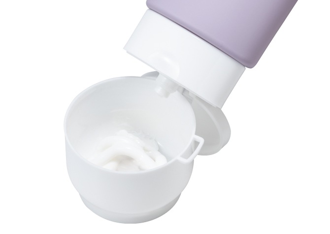 ピックアップクリームを約15g出します。別売りの専用カップの場合、内側の目盛線の高さまで、円を描くようにふんわりと出してください。カップがない場合、人差指と中指を合わせた指2本の面が隠れるくらいクリームを出すと、顔のパックの適量になります。