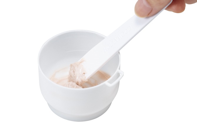ボトルの上部を持って傾け、上の人差し指でボトルを軽くたたいて、粉状のマスクを必要量だけティースプーンへ振り出します。(ボトルそのものを振ると、中身が使用料より多く出ることがあるのでご注意ください)