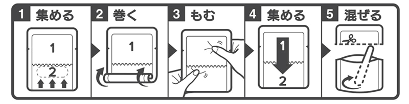 袋の中から本品を取り出し、図のようにクリームとパウダーをよく混ぜ合わせた後、目の周りを避けてお手持ちのスパチュラ等で肌がかくれるくらいにぬります。3~10分後に、軽く取り除いた後、水かぬるま湯で洗い流してください。パック後は、お手持ちのスキンケアで肌を整えてください。 ※取り除いたパック剤は自治体の区分に従って廃棄してください。取り除かずに洗面台や流しに流しますと、詰りの原因になりますのでご注意ください。