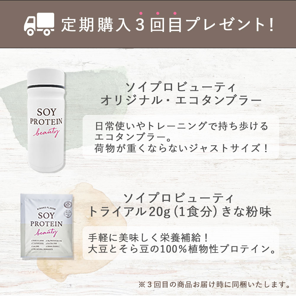・3 回の継続で「ソイプロビューティ」オリジナル・エコタンブラーと「ソイプロビューティ」トライアル20g(1食分)きな粉味をプレゼントいたします。
