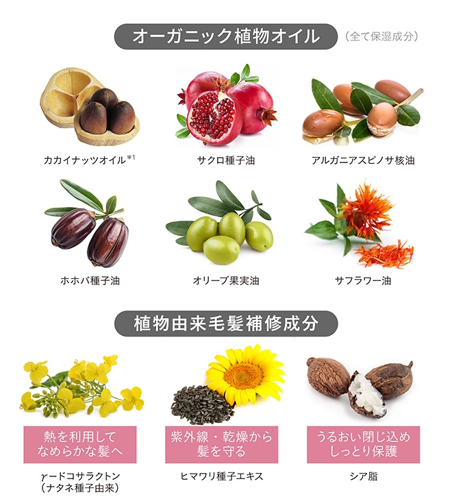 スタイリング・ケア機能植物成分:カリオデンドロンオリノセンセ種子油(カカイナッツオイル)、サクロ種子油、γ-ドコサラクトン(ナタネ由来)、ヒマワリ種子エキス、シア脂、ホホバ種子油、アルガニアスピノサ核油、コメヌカ油、サフラワー油、オリーブ果実油、ツバキ種子油