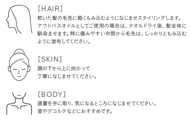 ヘア:乾いた髪の毛先に軽くもみ込むようになじませスタイリングします。アウトバスオイルとしてご使用の場合は、タオルドライ後、髪全体に馴染ませます。特に傷みやすい中間から毛先は、しっかりともみ込むように塗布してください。