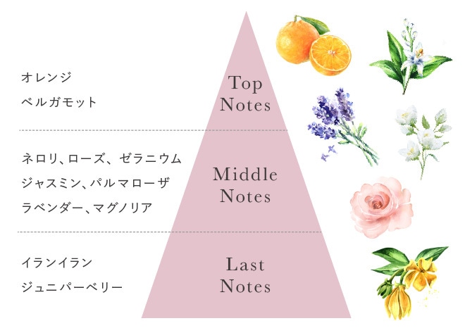 ビターオレンジ花(ネロリ)、イランイラン、ダマスクバラ、ニオイテンジクアオイ(ゼラニウム)、ジャスミン、オレンジ、ギンコウボク(マグノリア)、セイヨウネズ(ジュニパー)、パルマローザ、ラベンダー、ベルガモット〉